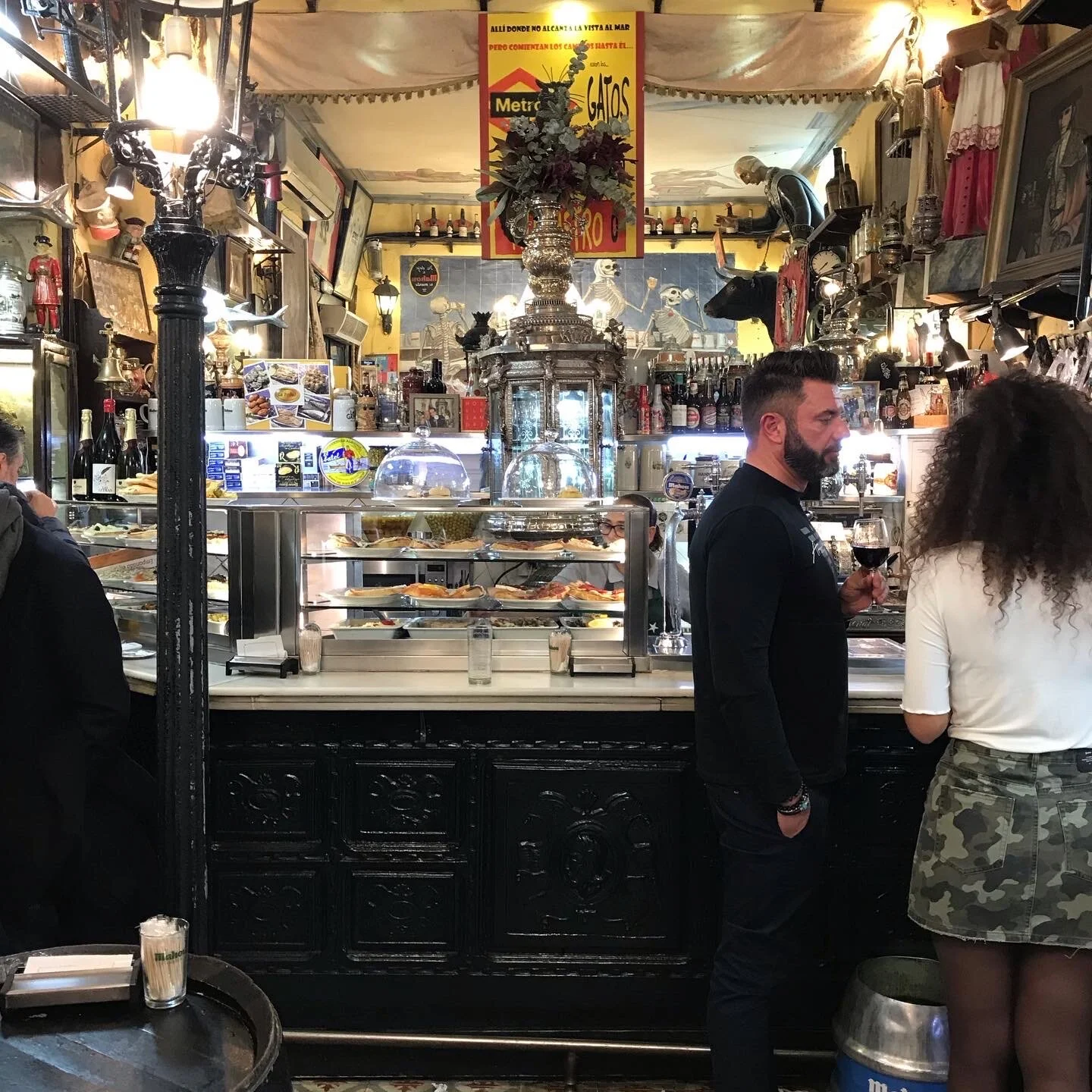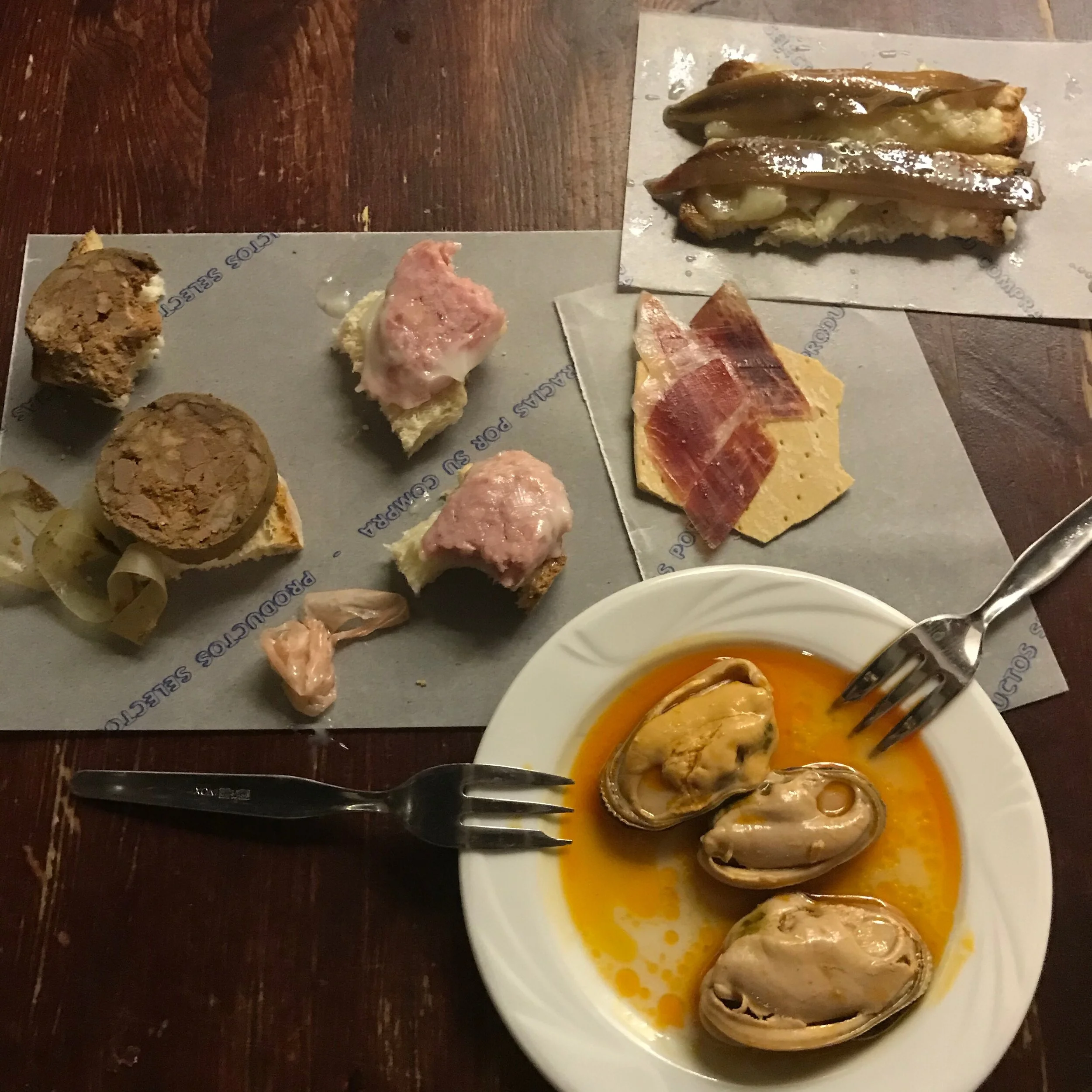 Plates appear at tables a few at a time, usually with every round of drinks, a never ending parade of saucers, earthenware, and bowls. Gathered around, small groups of Spanish – the same as yesterday – are either standing at the bar inside or reclining in plastic chairs around folding tables out on the sidewalk. You know they are Spanish because 1.) foreigners and tourists have eaten already (whatever the meal, the Spanish lag by about 3 hours compared to the rest of the world) and 2.) they’re wildly gesticulating, toothpicks used for picking up the small bites thrust like lances into the air. They discuss politics and the weather with equal voracity, talking over each other between mouthfuls of manchego, shrimps glistening with peppery oil, and papas bravas (fried potatoes with paprika aioli). Arguments about fútbol accompany the olives, and hushed parish drama is passed along with the napkins used to wipe oily fingers, and just as quickly balled up and forgotten on the floor. Family affairs (usually to do with the grandkids) are shared to unrestrained joy or scornful tutters, and accordingly toasted or washed down with everyones drink of choice. Most people, by meals end, won’t have even considered the food, short of quickly ordering everyones favorites at the outset. For going out is the objective, to catch up with family and friends, eating and drinking only its natural byproducts.
